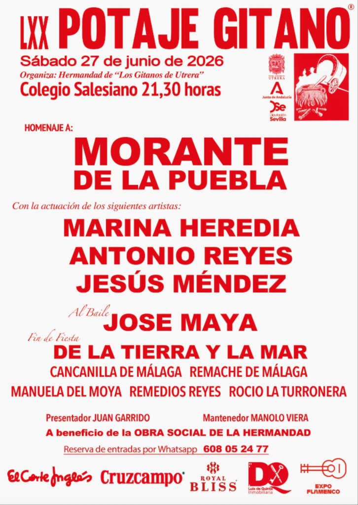 La LXX edición del Potaje Gitano de Utrera alcanza este año una dimensión extraordinaria, no solo por su septuagésimo aniversario, sino por la figura a la que rinde tributo. La Hermandad de los Gitanos ha anunciado que el homenajeado de esta edición será el diestro Morante de la Puebla, un artista que trasciende el ámbito taurino para situarse en el territorio de lo simbólico. Con este reconocimiento, el festival vuelve a sellar el histórico maridaje entre el flamenco y la tauromaquia, dos artes que en la figura del torero cigarrero encuentran un nexo común de pureza, clasicismo y duende.